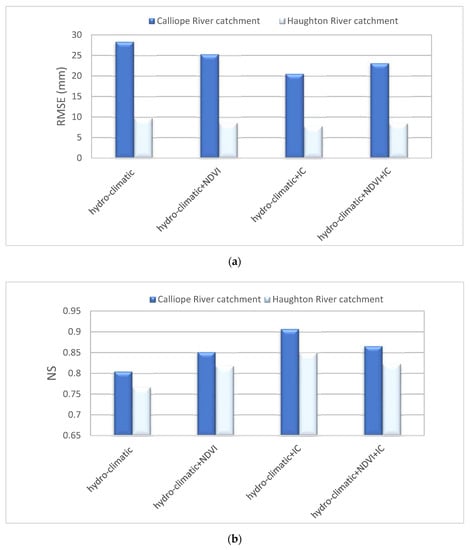 Here we analyzed two different patterns of hydro-climate data as ANN inputs: (i) rainfall data and (ii) a combination of rainfall and runoff data. Based on RMSE, NS, and R2, the best input pattern in first group was for Haughton River and for Calliope River. In the second group, was the best model for Haughton River and for Calliope River (Table 4). Overall, results showed that for both catchments, including rainfall of the previous months increased model accuracy compared to just using rainfall of the same month. This shows the importance of antecedent soil moisture in the runoff generation process [68]. Additionally, including runoff and rainfall together as input data slightly improved model performance for both catchments (Table 4), indicating that only using rainfall is insufficient to precisely estimate runoff, while combining this with antecedent runoff improves predictions [59].