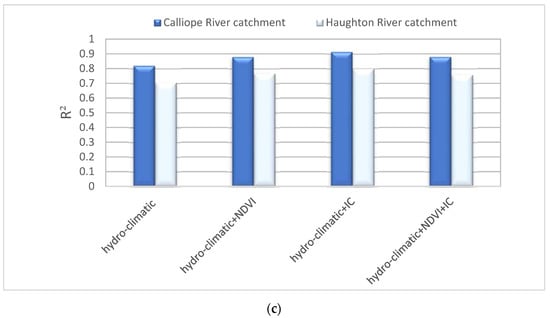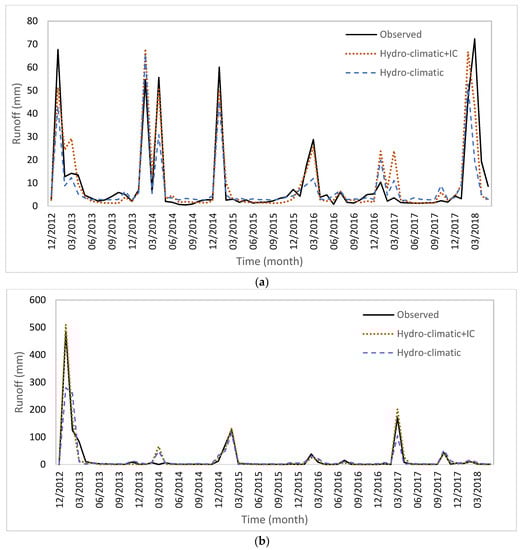 Moreover, plots of temporal variations of observed runoff versus simulated runoff of the best model using only hydro-climatic inputs ( for Haughton River and for Calliope River) and simulated runoff of the best model using a combination of hydro-climatic inputs with new inputs ( for Haughton River and for Calliope River) are shown in Figure 8a,b for Haughton and Calliope Rivers, respectively. These graphs confirm the agreement between observed and simulated runoff values during the validation period when IC is used along with hydro-climatic inputs, particularly for Calliope River.