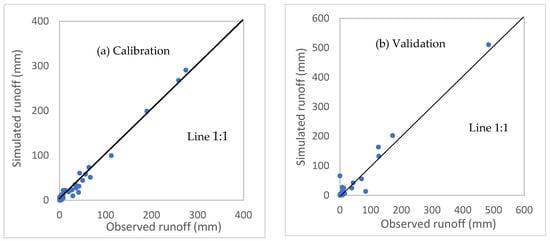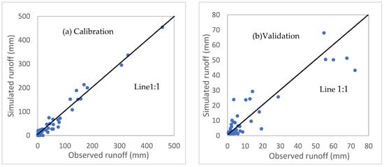 where, is the number of data, and are the ith observed and simulated runoff, respectively, and and are the average of observed and simulated runoff, respectively. Higher R2 values represent better correlation between simulated and observed values. The RMSE ranges from 0 to +∞, with 0 indicating a perfect fit of the model to observed values. The range of NS values is from −∞ to 1, with a perfect match of simulated and observed values indicated by 1, a value of 0 indicates that simulated data are no better than taking the mean of the observed data, and values <0 indicate very weak model performance. Generally, is considered as acceptable model performance [50].