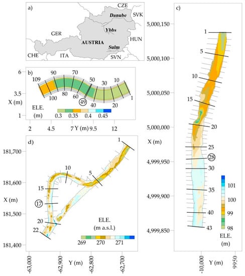 The locations of the different case studies are depicted in Figure 1a. Case study 1 (C.1) “S-Shaped Trapezoidal Channel” (Figure 1b) represents controlled conditions within a laboratory experiment and was selected to focus on the influence of river bends without any morphological structures. C.2 “Ybbs” (Figure 1c) was chosen to investigate the effects of a pool-riffle section in a stretched natural river site [72]. The complex morphology of the second natural river site C.3 “Sulm” (Figure 1d) combines the different characteristics representing a river meander with pool-riffle sections [72].