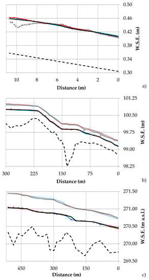 Calibration—Longitudinal profile plots of (a) C.1, (b) C.2 and (c) C.3 including bed elevations (dashed black line) and comparisons of measured (black crosses) and modelled water surface elevations (W.S.E.) at low flow () conditions (results of 1D simulations = blue solid line, 2D simulations = red solid line and 3D simulations = black solid line); Comparison of modelled W.S.E. at an additional discharge scenario (mean flow ) in C.2 and C.3 (results of 1D simulations = blue dotted line, 2D simulations = red dotted line and 3D simulations = black dotted line).