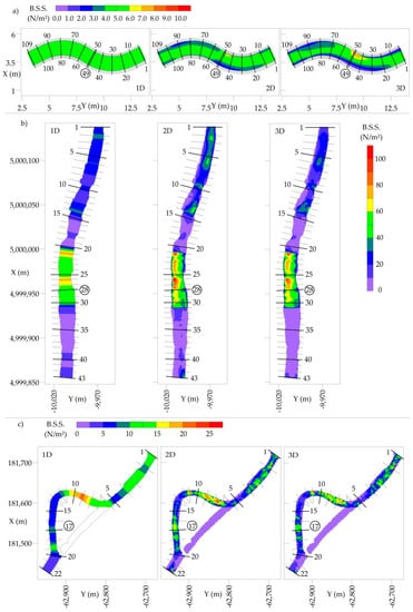 Comparison of bed shear stresses calculated by 1D/2D/3D models depicted for (a) C.1, (b) C.2 at and (c) C.3 at .