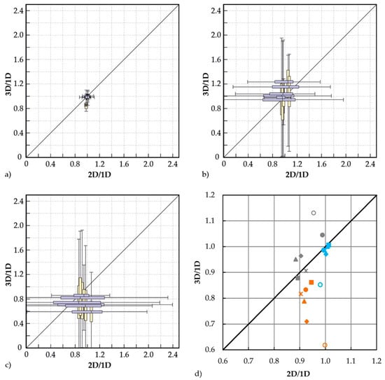 Relative comparison of the modeling results of (a) water depths, (b) depth-averaged flow velocities and (c) bed shear stresses consisting of ratios between 3D and 2D values, referring to 1D values depicted in box-plots for each case study and discharge scenario; (d) Average ratio between 3D and 2D values, referring to 1D values for water depths (blue), flow velocities (grey) and bed shear stresses (brown) depicted for each case study and discharge scenario (C.1 (*), C.2- (▲), C.2- (♦), C.2- (○), C.3- (■), C.3- (●)).