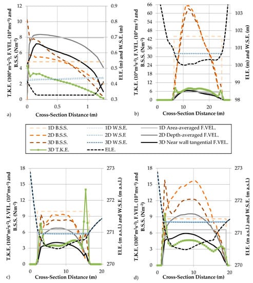 Figure 6 depicts the simulated hydrodynamics of all model dimensions including bed shear stresses, flow velocities, turbulent kinetic energy (3D) and water surface elevations in three representative cross-sections of all case studies (CS 49 of C.1, CS 28 of C.2, CS 17 of C.3—encircled in Figure 1). The different model dimensions are based on various definitions of flow velocities. The area-averaged flow velocity (light grey solid line) in the case of 1D, the depth-averaged flow velocity (2D—dark grey solid line) and the near-wall tangential flow velocity (3D—black solid line), which equals the near-wall flow velocity in the case of small bed cell slopes.