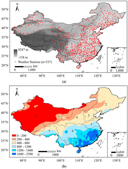 Precipitation data from 537 stations over China during the period 1961–17. (a) Location of 537 weather stations and topography over China; and (b) Annual precipitation (mm) and nine major river basins in China (1 = Continental River Basin; 2 = Songliao River Basin; 3 = Haihe River Basin; 4 = Yellow River Basin; 5 = Huaihe River Basin; 6 = Yangtze River Basin; 7 = Southwest River Basin; 8 = Southeast River Basin; 9 = Pearl River Basin).