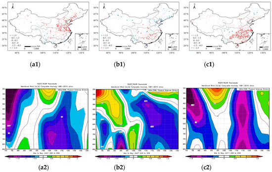 In 2001, nearly all stations over north and central China undergone a drought condition (SPI < −0.5), while many stations, covering the entire Huaihe river basin, northwest of the Yangtze river basin, southeast of the Yellow river basin and south of Haihe/Songliao river basin, have experienced an extreme drought (SPI < −1.5), as shown in Figure 2a1. Figure 2a2 displays the meridional wind composite anomaly between 25 °N–40 °N and 70 °E–135 °E. There are visible blue band ranging from 70 °E–90 °E in the higher atmosphere and 100 °E–125 °E in the lower atmosphere. As there are limited meteorological stations and the effect of meridional wind is also weaker on local weather due to high altitude over China in the region 70 °E–90 °E, the significant influence of weaker meridional wind that can also be detected comes from the range 100 °E–125 °E, where extreme drought prevails. The mechanism that weaker meridional wind led to lower precipitation is also apparent—less moisture is transferred by meridional wind from the south sea to land in the north.