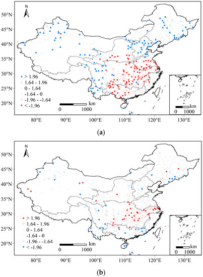 Trend analysis is often used to detect changes in time-series data. One of the commonly used non-parametric trend tests is called the Mann–Kendall (MK) test [21,22,29,30]. The null hypothesis H0 indicates that sample data (Xi, i = 1, 2…, n) are randomly ordered and there is no trend, while the alternative hypothesis H1 represents a monotonic trend in X. MK test uses Z to denote the trend in time-series data: The symbol of Z represents the trend direction (positive for an upward trend, vise-versa for negative), and the magnitude of Z relates to the slope of trend and the significance level, where |Z| > 1.64 for the 10% significance level and |Z| > 1.96 for the 5% significance level. Because the existence of autocorrelation in the dataset will affect the probability of detecting trends, which is often ignored, Hamed and Rao [31] developed a modified non-parametric trend test whose accuracy is better than the original MK test when considering empirical significance level. In this study, the modified MK test is adopted.