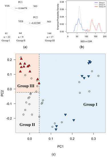 PCA has been applied on the eight possible precursors of ESD to obtain linearly uncorrelated variables (PCs). The dimension reduction result is shown in Table 2. Although there are many rules to select PCs—based upon eigenvalues of the covariance matrix of dataset or proportion of variance—we select PCs according to the requirement and result of the following analysis. Based on PC1 and PC2, we use a tree-based model to classify ESD frequency in CDR into three groups, as shown in Figure 4a: Group 1, PC1 ≥ 0.04479; Group 2, PC1 < 0.04479 and PC2 < −0.02289; Group 3, PC1 < 0.04479 and PC2 ≥ −0.02289. From the empirical probability density of ESD frequency of each group in Figure 4b, Group 3 shows a higher probability in higher ESD frequency. Figure 4c uses PC1 and PC2 to partition ESD, where blue background means Group 1 and red for Group 3. The red triangles and blue inverted triangles represent upper and lower quantile of ESD, with all red triangles located in Group 3 and all blue inverted triangles in Group 1. That is, when PC1 < 0. 04479 and PC2 ≥ −0.02289, the ESD frequency is significantly greater. This result may be used as an effective warning signal∔when PC1 < 0.04479 and PC2 ≥ −0.02289, the drought risk is higher over CDR.