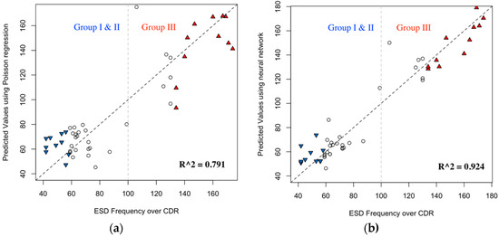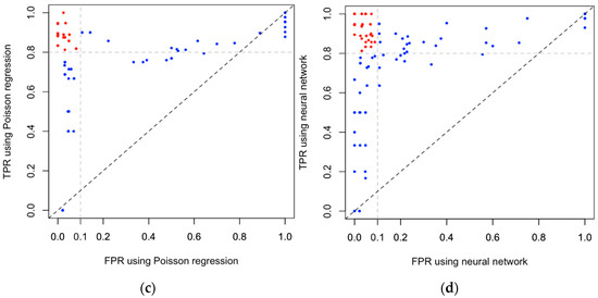 After testing the effectiveness of four candidate predictors, we used leave-one-out cross-validation to investigate the predictability of Poisson regression and neural networks. The predicted ESD versus original records is given in Figure 5a,b, where the high R-squared value (0.791 for Poisson regression and 0.924 for neural networks) suggests PCs of teleconnection indices to be useful in the prediction of ESD over CDR. In addition, the application of the neural networks to the PCs resulted in a significant improvement in the under-estimation of the top quartile group in ESD with a high determinant (R2 = 0.924). For the ROC analysis, we predict the ESD of one decade for each time using Poisson regression and neural networks, and then classify the predicted result and original ESD based on thresholds, ranging from minimum to maximum ESD, to be positive (both greater than, equal to or less than the threshold) or negative. After that, we plot the results as shown in Figure 5c,d. The diagonal line connecting the left bottom and top right corners represent random guess results. Points below the line indicate worse results than random guesses, points closer to (0,1) suggest better results. The red points in the figure indicate FPR < 0.1 and TPR > 0.8, so the corresponding thresholds (around 80 for Poisson regression and 100 for neural networks) are useful in classifying the predicted results. For neural networks, ten thresholds around 100 can lead to a perfect classification result with FPR = 0 and TPR = 1. This result suggests Poisson regression and neural networks to be helpful in predicting ESD over CDR using teleconnection indices.