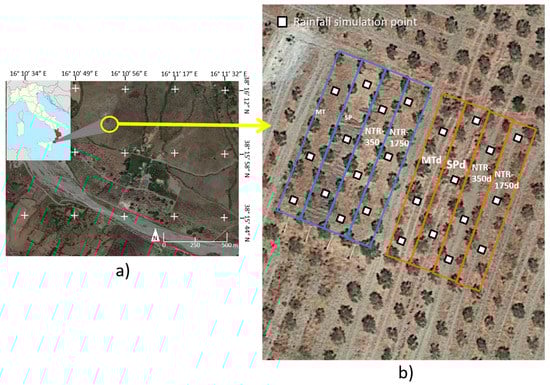Location (a) and aerial view (b) of the experimental plots (Locri, Southern Italy). Soil Management Practices (SMP): SP = Standard Protection of soil by a sheet; MT = Mechanical Tillage; NTR-350 = No Tillage and Retention of vegetal residues at a dry matter dose of 3.5 tons/ha; NTR-1750 = No Tillage and Retention of vegetal residues at a dry matter dose of 17.5 tons/ha); the letter “d” refers to plots under disturbed conditions due to rainfall simulations.