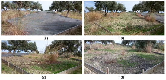 Views of the experimental plots subjected to the four SMPs (Locri, Southern Italy). Soil Management Practices (SMP): SP = Standard Protection of soil by a sheet (a); MT = Mechanical Tillage (b); NTR-350 = No Tillage and Retention of vegetal residues at a dry matter dose of.5 tons/ha (c); NTR-1750 = No Tillage and Retention of vegetal residues at a dry matter dose of 17.5 tons/ha) (d).