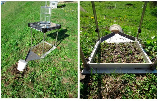 The Eijelkamp® rain simulator (hereafter “RS”) was applied [,], simulating 3 rainfall events at the top, middle, and bottom of each eight-experimental plot (Figure 3). Before its use, RS was calibrated to produce 25 mm-deep rainfall with a constant intensity of 50 mm/h for 30 min and a specific kinetic energy of 121 J/(m2·mm) over an area of 0.25 m2. This rainfall intensity is typical of erosive events occurring in this area every 30–50 years (this return interval was estimated by statistically processing an 80-year historical rainfall series, collected in nearby rain gauge stations). During the simulations, the surface runoff volume was collected on a time scale of minutes; time to peak (hereafter “Tp”), peak runoff (“Qp”) and cumulative surface runoff (“SR”) volume were measured. More specifically, “Tp” was the time that elapsed from the measurement start to “Qp” occurrence; “Qp” was the maximum runoff volume; “SR” was the integral in time of “Qp”. In addition, the mean infiltration rate (“IR”) was estimated, subtracting the measured runoff from the simulated rainfall and relating this water volume to the time elapsed from the measurement start. All measurements (in triplicate for each treatment) were carried out in the lane area during the spring.