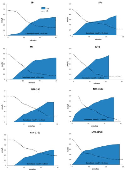 Soil disturbance by the simulated rainfall (i) reduced “IR” by 23.3% (“SPd” vs “SP” plots) to 74.4% (“MTd” vs “MT”) with a mean value of 51.4%; (ii) increased “Qp” by 8.6% (“SPd” vs “SP”) to 47.6% (“NTR-1750d” vs “NTR-1750”) and on average by 19.3%; (iii) shifted down Tp from 29–30 min (undisturbed plots) to 24 (“MTd” plots)—28 (“NTR-1750d”) minutes (on average, Tp decreased by 10.9%); (iv) produced higher runoff (+29.0%) compared to undisturbed plots (Table 1 and Figure 5).