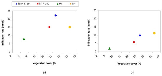 An important consideration is the relationship between the mean infiltration rate IR and the vegetation cover of plots. In general, the higher the vegetal cover, the higher infiltration rate IR, with the exception of the “SP” plot (Figure 5a). It should be also noticed that the vegetal cover of “MT” plots was much reduced, as an effect of tillage, which may have contributed to the increased runoff generation, the soil being left bare during the precipitation.