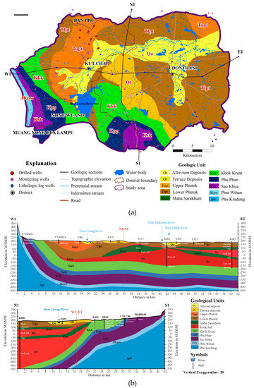 The geology of the CHLB was compiled, modified, and reinterpreted from a geological map of the Department of Mineral Resources [35], potash investigation wells [36], a previous study of Cotanont [37], and drilling for water wells and piezometers with depths of 8–81 m from the current project [38]. The study area is underlain by nine geologic formations, characterized, from the youngest to the oldest formations, as follows: Alluvium (Qa), Terrace (Qt), Phutok (Tpt), Maha Sarakham (Kms), Khok Kraut (Kkk), Phu Phan (Kpp), Sao Khua (Ksk), Phra Wihan (JKpw), and Phu Kradung (Jpk) formations (Figure 3 and Figure 4). Alluvium formation mainly consists of a combination of sand, gravel, and clay. It was deposited along the floodplain of the Huai Luang River and the sediments were deposited in age from the mid- to late Quaternary. Another Quaternary formation in this area is a Terrace formation that consists of gravel and sand; it can be found in the central to southeastern part of the study area. This alluvium is underlain by the Phutok formation, which is composed of sandstone with reddish brown color, medium grain, and siltstone. Large-scale cross bedding, desiccation cracks, and coarsening upward sequences can be commonly found locally. The total thickness of the Phutok formation varies from 10 to 250 m and the formation crops out all over the basin except in the west. The Phutok formation can be divided into two units (upper and lower) that range in age from Tertiary to upper Cretaceous. The upper unit consists of cross-bedded, fine-grained reddish sandstones interbedded with siltstones, underlain by reddish brown siltstones interbedded claystone of the lower unit. Underlying the Phutok formation is the Maha Sarakham formation, which is composed of claystone interbedded with rock salt, gypsum, anhydrite, and potash. The formation is present at the depths of 30–500 m below the ground surface. This formation does not outcrop in the study area as it is covered by the younger formation (Qt, Qa, and Tpt). However, its presence is critical with regard to water quality in the region due to the existence of rock salt layers. A distinct contact of claystone and rock salt was found in the exploration potash wells at a depth of 25–180 m below the ground surface. Khok Kruat formation was deposited underneath Maha Sarakham formation, which is composed of medium to coarse-grain sandstone, siltstone, claystone, and conglomerate, of reddish-brown color, and was deposited in the early Cretaceous. Khok Kruat formation can be found in the west and south of the basin and is underlain by medium to coarse-grained sandstone, conglomerate sandstone, and conglomerate, whitish gray in Phu Phan formation (early Cretaceous). Sao Khua formation is overlain by Phu Phan formation and is composed of sandstone, siltstone, claystone, and conglomerate, reddish-brown and medium- to coarse-grained (early Cretaceous). Sao Khua formation is underlain by Phra Wihan formation at the west and south of the basin and consists of sandstone, conglomerate sandstone, and conglomerate, medium-grained, whitish-gray color, and with a depositional age from the mid-Jurassic to the early Cretaceous. The lowest formation, which can be found in the west and south, is the Phu Kradung formation. This formation consists of sandstone, siltstone, claystone, and conglomerate, reddish-brown, ranging from medium- to coarse-grained, deposited during the mid- to late Jurassic.