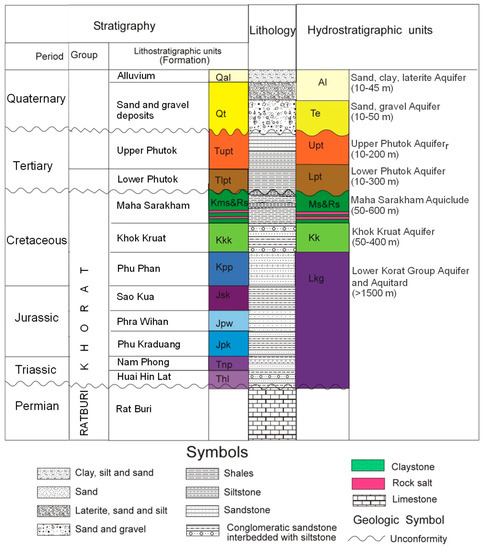 The main aquifers are sand and gravel of Alluvium and Terrace formations, and sandstone and siltstone of the Phutok and Khok Kruat formations. Results from 10 pumping tests with observation wells and two sites of dispersivity tests in this study, and 24 single well tests [37], were used to estimate the range of transmissivity, horizontal hydraulic conductivity, storage coefficient, and longitudinal dispersivity values for the CHLB aquifers (Table 1). Seven hydrogeological units were identified for formulating a conceptual framework of the groundwater model classified in the study area. Alluvium unit (Al) is one of the major aquifers, composed of sand, clay, and gravel and located along the flood plain of the Huai Luang River, with a thickness of about 10–45 m. Terrace unit (Te) is one of the sand and gravel aquifers found in upland areas in the southern part of the study area, from Huai Luang River to the middle part of the study area, with a thickness of 10–50 m. The Upper Phutok unit (Upt), with a thickness of 10–200 m, consists of fine-to-medium sandstone and siltstone. The formation is easily fractured and is usually a productive aquifer, found in the northwest and northeast parts of the study area. The Lower Phutok unit (Lpt), which consists of clay and claystone with an average thickness of about 10 to 300 m, is underlain by a layer of rock salt. Maha Sarakham unit (Ms) is a very low-permeability unit of rock salt, anhydrite, and gypsum interbedded with mudstone deposited under the Lpt Unit with the thickness varying from 50 to 600 m. The Khok Kruat unit (Kk) is found at the foot of the mountain, consisting of siltstone and sandstone with a thickness of 50–400 m. Underlying the Khok Kruat unit, the Lower Khorat Group unit (Lkg), consists of sandstone, siltstone, claystone, and a conglomerate of the Phu Phan, Sao Khua, Phra Wihan, and Phu Kradung formations (Figure 4).