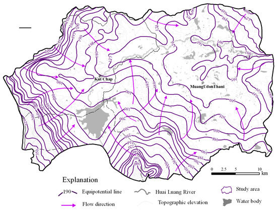 Groundwater level, measured in 152 wells in 2014, shows that the water level varies from 4.6 m above the ground surface to 21.6 m below the ground surface. Groundwater flow primarily occurs in the lowlands of the Huai Luang floodplain, whereas deep water was found in the south and west, where the surface elevation is relatively high. The equipotential lines and groundwater flow directions measured during 2014 are depicted in Figure 5. Regional hydraulic heads in sandstone and siltstone of the Phutok, Khok Kruat, and the Lower Khorat Group aquifers range from 160 to 350 MAMSL. Generally, groundwater recharges to the aquifers in the west, south, and local recharge hilly areas in the north (recharge areas), whereas the discharge areas are normally found along the Huai Luang River floodplain and the central part of CHLB. The regional groundwater flows towards the north and northeast and discharges into the Huai Luang River.