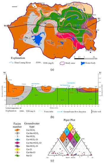 Figure 6. Groundwater type of CHLB. (a) Hydrogeochemical facies map; (b) Hydrogeochemical facies cross section along line W1 to E1; (c) Piper plot diagram of groundwater samples.