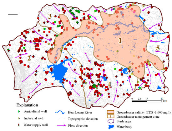 For better estimating the sustainable yield and future planning and implementing groundwater development control measures, the spatial distribution of groundwater management zones was divided in this study. The groundwater management zones were divided into five zones based on their concentrations of TDS and groundwater flow systems. The high salinity zone or zone 1, which is the high TDS zone, was bounded by the area with TDS concentration higher than 1000 mg/L, whereas other groundwater management zones were bounded based on groundwater flow systems in accordance with the flow directions and sources of their recharge areas. Groundwater management zones 2 to 5 were divided from the area outside zone 1 into four zones, as shown in Figure 7. Most of the groundwater is abstracted from zones 2 and 4, and groundwater level withdrawal was intensively observed. Zones 3 and 5 are at risk from groundwater salinity upconing and a decline in water level due to being located in a discharge area where the rock salt of the Maha Sarakham formation is shallow, and the groundwater pumping rate is relatively high. Groundwater pumping within zones 2 and 3 accounted for about 34% and 33% of groundwater usage, respectively, generally extracted from the Khok Kruat, Lower Khorat Group, and Upper Phutok aquifers (Figure 8a). Groundwater in zones 1–3 was generally extracted from the Lower Phutok aquifer, which is underlain by rock salt of the Maha Sarakham formation. Domestic and water supply was the main purpose for almost every zone, except zone 3 (Figure 8b). Groundwater usage for agriculture is relatively high in zones 3 and 4, due to the Department of Groundwater Resources (DGR) offering agricultural wells for groups of farmers, while groundwater for the industrial and business sectors was mainly extracted from zones 1 and 5.