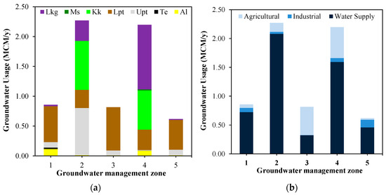 Figure 8. Comparison of groundwater usages and groundwater management zones for (a) hydrostratigraphic units and (b) types of groundwater usage.