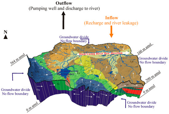 The configuration of the CHLB aquifers is an elongated shape that covers an area of about 1529 km2. The basin is enclosed by mountain ridges and hills in the west, south, and north, and the Huai Luang River cuts through the whole of the basin area and flows east between the mountains to the west and north, as shown in Figure 9. The groundwater flow in the aquifer system mainly converges from the west, south, and north towards the plains in the middle of the basin. The CHLB aquifer domain is conceptualized based on the geological and the hydrogeological components depicted in Figure 9. Seven hydrostratigraphic units (aquifers and aquitards) were assigned with several hydraulic properties, as indicated in Table 1. These parameters are significant properties of the units that were used as initial inputs in the numerical model. The sand, clay, and gravel of Al and Te units have a thickness of 10–40 m, the siltstone and sandstone aquifer of the Upt unit has a thickness of 30–200 m, the claystone of the Lpt unit has a thickness of 10–280 that is underlain by the rock salt layers of the Ms unit, and the siltstone and sandstone aquifer of Kk unit and Lkg unit has a thickness of 430 to 700 m. Various types of boundary conditions are used to characterize key features of the groundwater system. A no-flow boundary condition was applied at all layers at the lateral boundaries to coincide with the presumed groundwater divides in all directions of the basin, as well as the bottom boundary. Huai Luang Reservoir, Huai Luang River, and its tributary were assigned to river boundary conditions. Net recharge was evaluated by the HELP3 model [47], which applied to the top of the active portion of the top model layer by zone.