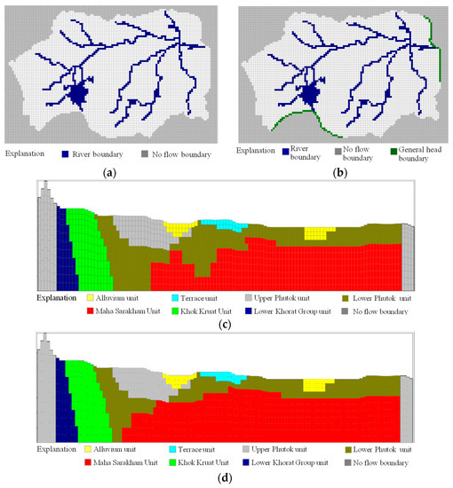 The groundwater domain encloses an area of 40 × 60 km and 450 m in depth. The model domain is a uniform square grid comprising a grid of 500 × 500 m, as shown in Figure 11. A digital elevation model was used to define the upper surface of the aquifer system. The thickness of model was separated into 11 layers 10–40 m thick, between the elevations of 0–564 MAMSL. The model layer thickness varies with changes in topography; upper layers (layers 1 to 3) were assigned to be 10–15 m thick, while the thicknesses of model layers 4 to 11 is about 25–40 m. The groundwater domain was designed using physical boundaries and a conceptual model of the basin. For models A and B, the boundaries of the study area were applied to a no-flow boundary condition or inactive cell in all layers and all directions (Figure 10a). A no-flow boundary condition in models C and D was applied at the rim of the study area with presumed groundwater divides in the mountain and hill ridges of west, south, and north. Huai Luang River, cut off from the whole basin at the east and southwest, was applied to general head boundaries in all layers (Figure 10b). The volume of general head boundaries assigned for Huai Luang River was collected from hydrological stations Kh.103 and Kh.53. The boundaries and geometry of aquifer properties such as hydraulic conductivity, storage coefficients, porosity and dispersion coefficient, were assigned to the groundwater model as the value in Table 1. In models A and C, the shapes of aquifer property zones within the model layer are based on geology, lithology, and conceptual models of the flow system (Figure 10c). The shape of rock salt in models B and D was constructed to be shallower than model A—about one layer or 10–20 m in areas that do not have deep wells or evidence that confirms the depth of the rock salt (Figure 10d). The uppermost layer was treated as an unconfined aquifer, while the others were treated as confined aquifers; the storage coefficient was assigned as the specific yield for unconfined and storativity for confined aquifers.