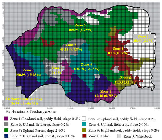The groundwater model calibration was carried out to assure reasonable results and model accuracy. The initial model (model A) was calibrated by manual trial and error method to minimize the difference between simulated and observed hydraulic heads for groundwater flow, and to compare the simulated and observed salinity values (TDS) in the solute transport model. The transient model during the period from 2010 to 2015 was simulated with the models HELP3 and SEAWAT. Hydraulic heads and salinity in 89 observation wells were monitored from September 2014 to December 2015 and selected as calibrated data. Horizontal and vertical hydraulic conductivities were changed during the calibration process, as well as the groundwater recharge rates. Recharge rates are the most sensitive parameter of a groundwater flow system, while dispersivity is the most sensitive parameter of a groundwater solute transport [9]. Accordingly, these parameters of aquifer properties, including the horizontal and vertical hydraulic conductivities, specific storage, specific yield, dispersion coefficient, and porosity of each hydrogeological unit, can be adjusted to meet the calibration targets. The uniform anisotropy ratio between horizontal and vertical hydraulic conductivities of 1:10 was not adjusted during the calibration process. The calibrated value of aquifer properties obtained is presented in Table 3. The groundwater recharge model was calibrated under the SEAWAT model by varying the annual average recharge rates as a percentage of precipitation. Once it was calibrated, relative recharge rates were fixed in each zone, and the calibrated recharge rates from the SEAWAT model were used to calibrate the input parameters of the HELP3 model. Recharge rates used in the HELP3 model were recalibrated by varying the properties of input parameters until the volume of annual recharge from HELP3 met the lump sum volume of recharge from the SEAWAT model. The calibrated HELP3 model was used to estimate the daily fluctuation of recharge rates and changes of climate in the future. The groundwater recharge rates vary from 0% to 15.25% of rainfall or 0 to 190.98 mm/year (Figure 11) and gradually increase from discharge areas to recharge areas. A high recharge rate was found in recharge zones 4, 5, and 7, which are located in the recharge areas, where there is a high infiltration rate of highland and upland soil and coverage of forest and field crop. A low recharge rate was found in lowland discharge areas, which have a low infiltration rate of fine-soil texture and are used as paddy fields.