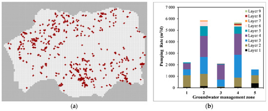 Figure 12. Locations of pumping well (a) and pumping rates in groundwater management zones from model layers (b).