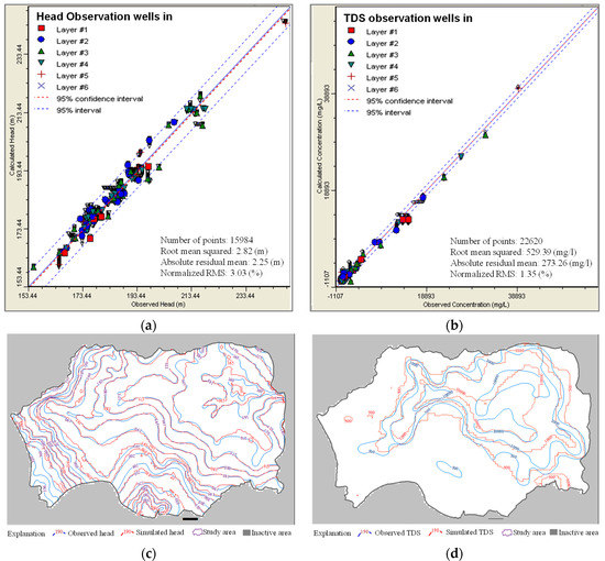 The calibration performance was evaluated by visual and statistical comparison of the observed and simulated data. The groundwater levels and salinity, in terms of TDS between the observed versus the simulated, both groundwater level and TDS, were measured and the statistical results of root mean square error (RMS) and the normalized root mean square error (NRMS) were analyzed. Figure 13 presents a scatter plot of observed and simulated hydraulic head, and simulated TDS, with statistical values (2010–2015) for model A. The RMS and NRMS of the hydraulic head are 2.82 m and 3.03%, and TDS are 529.39 mg/L, and 1.35%, respectively. In addition, all correlated points are well within the 95% confidence interval of the slope 45 degrees from linear regression. These statistical results confirm the well-calibrated model is in a reliable condition. The spatial distribution hydraulic head and TDS comparison between observed and simulated data of model A at the end of the model (2015) are shown in Figure 13. The pattern of the simulated hydraulic head and TDS were fit well to the observed values. In general, no apparent spatial patterns of error were discernible and the calibration is regarded as acceptable. For checking the validity of the model, the model was validated with 33 observation wells that had been monitored from 2010 to 2012 by [36]. The results of the statistical measurements of the calibration and validation period are presented in Table 4.