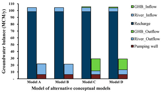 The accuracy of the groundwater flow model is limited by the hydrogeological conceptual model validity, the numerical flow model design, and the input parameters’ accuracy. Specific assumptions and simplifications for the conceptual model may lead to predictive modeling errors, which can lead to errors in policy or design for management. Policy and design decisions can be more robust if they are based on an explicit consideration of model conceptual uncertainty, which groundwater management studies are beginning to do [4,9,48]. In this study, four plausible alternative hydrogeological conceptual models (models A, B, C, and D) were constructed to simulate how the uncertainty associated with model geometry and boundary conditions influences the modeling results. The summary of alternative conceptual models’ conditions is presented in Table 2.