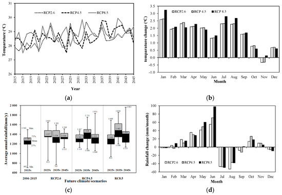 Projected annual rainfall is higher than in 2006–2015 for all scenarios (Table 5). In a comparison among the three scenarios, the annual precipitation indicates the strong fluctuation of extreme drought years in RCP2.6 scenario, while RCP8.5 scenario shows extreme heavy rainfall (Figure 16c). The RCP8.5 scenario projected the highest annual rainfall for almost every decade. The annual rainfall for all scenarios showed a gradually increasing trend between 2016–2025 and 2026–2035, and then a slight decrease in the last period (2036–2045) of the projection (Figure 16c). A comparison of these data during 2006–2015 indicates that average annual rainfall tends to increase by 5.85%, 6.94%, and 11.26% under the RCP2.6, RCP4.5, and RCP8.5 scenarios, respectively.