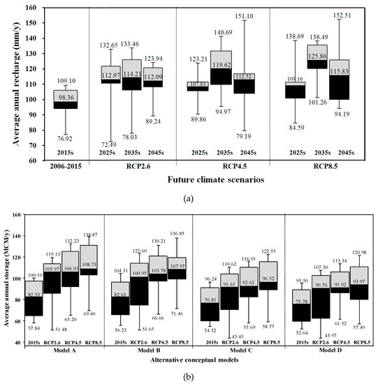 Figure 17. Simulation of future annual groundwater recharge (a) and simulations of future average annual aquifer storage of alternative conceptual models from 2016 to 2045 (b).
