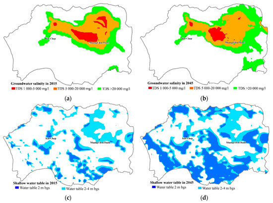Figure 18. Groundwater salinity distribution of shallow water table. (a) Groundwater salinity distribution in 2015; (b) Groundwater salinity distribution in 2045 of model B (RCP8.6); (c) Shallow water table distribution in 2015; (d) Shallow water table distribution in 2045 of model A (RCP8.6).