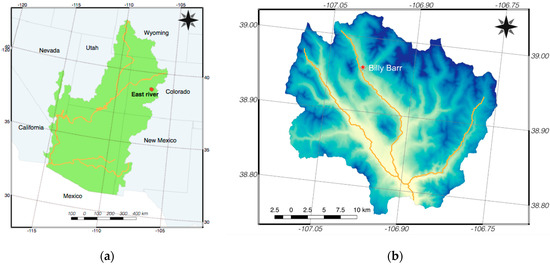 (a) The location of the Upper East River, CO Watershed study site in the Upper Colorado River Basin (red region). (b) Topography of the Upper East River, CO Watershed and associated drainage system, and the location of the Billy Barr meteorological station, which provided wind speed input for the evapotranspiration (ET) analysis.