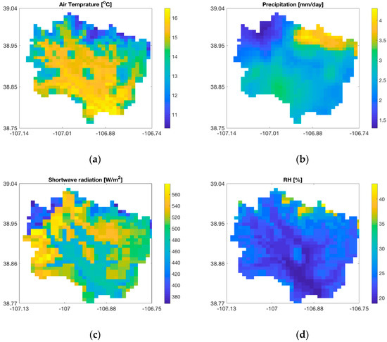 where es is the saturated water vapor pressure (Pa); e is the actual water vapor pressure (Pa) at air temperature T (°C) and RH is the relative humidity (%). All of these data were interpolated to the simulation map (900 × 900 m2 DEM map in Figure 3a). It is worth noting that both PRISM and Daymet databases considered the impact of topographical factors (e.g., aspect, slope and elevation) on the spatial distribution of meteorological forcing data. Examples of atmospheric temperature, precipitation, shortwave radiation and relative humidity on 8 August 1994 are shown in Figure 5. A comparison of Figure 2 and Figure 3a shows that there is a close correlation between the elevation and the meteorological data. For example, the precipitation, humidity and shortwave radiation gradually increase with increasing elevation. Details on these dependences are discussed in Section 3.4.