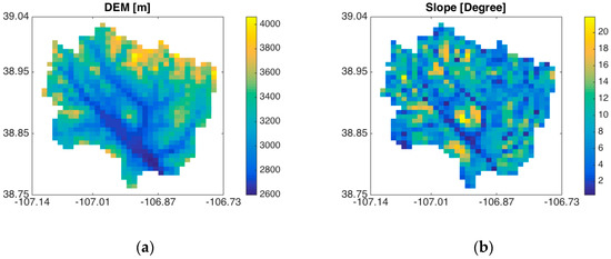 Our study area is the Upper East River Watershed, a headwaters catchment located in the Upper Colorado River Basin in Colorado (Figure 1a), which is the focus of the Department of Energy Watershed Function Project. We delineated the watershed using the ArcGIS watershed tool with NASA’s Shuttle Radar Topography Mission 30-m digital elevation model (DEM) data and coordinates for the United States Geological Survey’s (USGS) stream gauge No. 09112200 as the watershed outlet (Figure 1b). The total area of this watershed analysis is approximately 64 km2. We divided the whole watershed into 788 grid cells, each with a size of m2 and performed CLM simulations at each grid cell to calculate ET. The simulation period is 22 years, ranging from 1 January 1993 to 31 December 2014 with a daily time step. Below we describe the different watershed characteristics, soil properties and meteorological forcing data, which were used to estimate ET using different methods.