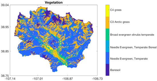 A vegetation map for the watershed was extracted from the 2006 National Land Cover Dataset (NLCD, USGS) with a spatial resolution of 30 m [27]. Conversion from the USGS vegetation types to CLM plant functional type was performed using the conversion method proposed by Ke et al. [28]. Figure 4 shows the plant functional type map that we used in this study. The figure indicates that there are six major plant functional types in the study site, including 49% needle evergreen—temperate; 6% needle evergreen—temperate boreal; 2% broad evergreen shrubs temperate; 30% C3 Arctic; and 2% C4 grass. In the site, 10% is bare soil, with a predominance in the upper elevations. We aggregated this map to determine the percentage of each plant functional type in 900-m spatial resolution map. CLM has a library that contains twelve values for twelve months (January to December) of LAI and plant top and bottom heights for each plant functional type, which we used to evaluate the influence of both spatial and temporal variation of vegetation on ET.