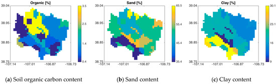 Maps of (a) soil organic carbon, (b) sand and (c) clay content estimated using the Natural Resources Conservation Service (NRCS) soil database.