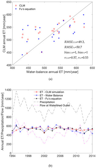 in which and are respectively, the calibration ET (CLM/Fu ET) and water-balance ET in year ith; N is the number of years (N = 21). Figure 6a indicates that there is relatively good agreement among the three methods. The RMSE is, respectively, 49.3 and 50.7 (mm) for the ET calculated by the CLM model and Fu’s equation. The bias criterion for both CLM simulation and Fu’s equation in comparison with the water-balance ET is equal to 1. However, when the annual ET is less than 500 mm, ET estimated by the CLM model and Fu’s equation is larger than by the watershed-scale water balance equation. By contrast, when the annual ET is smaller, ET obtained by the watershed-scale water balance equation is larger. This relationship stems from the assumption that the soil water storage does not change over time () in the watershed-scale water balance. In fact, in low precipitation years, soil is drier and and in high precipitation year, soil is wetter and . As a result, ET is larger in dry years and smaller in wet years.