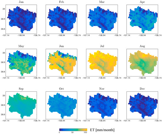 It is worth noting that in the East River, snow that accumulates during the winter months can contribute to evapotranspiration in summer months when snow melts. As a result, we could not estimate monthly ET using Fu’s equation for this case study. The monthly ET0 values calculated by Equation (2) are aggregated on an annual basis to use in the ET calculation in Equation (1).