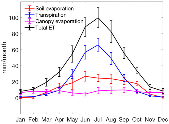 As for the temporal annual variation, Figure 8 also indicates that canopy evaporation is relatively stable over the year. By contrast, there are large differences in soil evaporation and transpiration in winter and summer. Soil evaporation and transpiration are negligible in winter and very large in summer. Soil evaporation increases from approximately zero in December–February to reach its maximum value (~27 mm/month) in June, while transpiration increases from zero in December-January up to 66 mm/month in July. The maximum ET of evaporation and transpiration does not occur at the same time because air temperature maximizes in July, but the soil surface is dry in this month, which limits the soil evaporation, while transpiration can take water from deep soil layers to meet the demand.