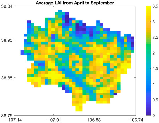 In addition to providing estimates of ET with high spatiotemporal resolution, the CLM also allows us to partition evapotranspiration into its components, namely, plant transpiration and soil and canopy evaporation. Here, we compared the contribution of each individual component to the total ET (Figure 8). These ET components are spatially averaged over the watershed. The figure indicates that transpiration contributes 50% of annual ET, while soil and canopy evaporation constitute 32% and 18%, respectively. However, in the winter months, the canopy evaporation is the main source of ET. This is reasonable because in winter, snow on the plant canopy is exposed to the sunlight. Therefore, it is easier for the canopy snow to sublimate than snow on the land surface. Exposure to sunlight is also the reason why transpiration is slightly larger than soil evaporation during winter (December to February) at this site. By contrast, transpiration is less than soil evaporation at the end of winter (March–April) and summer (October–November). Because leaf area index (LAI) is small during these months, it is reasonable that soil evaporation from melted snow water (in March–April) and non-frozen soil water (in October–November) is larger than transpiration. From April to September, transpiration is significantly larger than soil and canopy evaporation because in these months, vegetation develops and covers a large part of land surface. Figure 9 shows the average map of LAI from April to September to prove the effect of vegetation on total ET. As shown in Figure 9, LAI is relatively large in these months and can be up to 3.5.