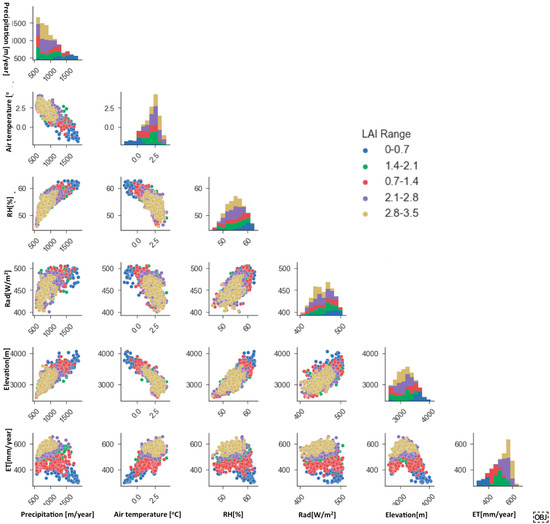 Pairwise scatter plots of meteorological forcing variables, elevation and annual ET. Different colors represent ranges of LAI values. Bar plots shows the variation of meteorological forcing variables, elevation and annual ET.