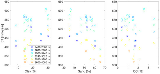 Scatter plots of clay, sand and organic carbon content and ET. Different symbols represent the different elevation ranges.