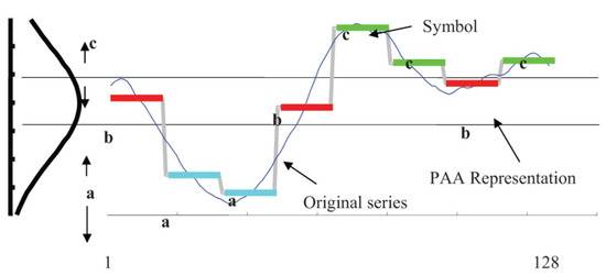 SAX was primarily developed to reduce the dense, lengthy information of a time series to a shorter sequence of characters. SAX has also been found suitable for various data mining tasks, including indexing [43], clustering [44,45], and classification [46]. SAX follows three main steps: