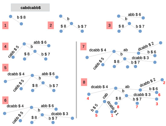A formal definition of the suffix tree, T, associated with a string x of n characters drawn from an ordered alphabet is the following. The string x is first noted as , and any sub-string of the form will be called a suffix of x. Let $ be a special character, matching no character in . The character $ is a right end-marker, and its purpose is to separate in T suffix from suffix , for , whenever the former is a prefix of the latter. This ensures that no suffix is a prefix of another suffix, and that there will be n leaf nodes, one for each of the suffixes of T. Consequently, each leaf of T is labelled with a distinct integer j such that the path from the root to the leaf j corresponds to the suffix [69]. Table 1 provides a summary of the main steps for the suffix tree creation process.