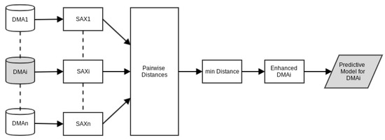 The enhancement prediction process shown in Figure 3 starts by selecting a DMA to be targeted. Then, each water demand time series is transformed into SAX for all the DMAs. All the pairwise distances between the target and the other DMAs are evaluated. The closest DMA to the target is selected to enhance the information of the predictive model on the targeted DMA. This process has a clear advantage over just one single predictive model and, in addition, shows one way to apply the knowledge produced by SAX.
