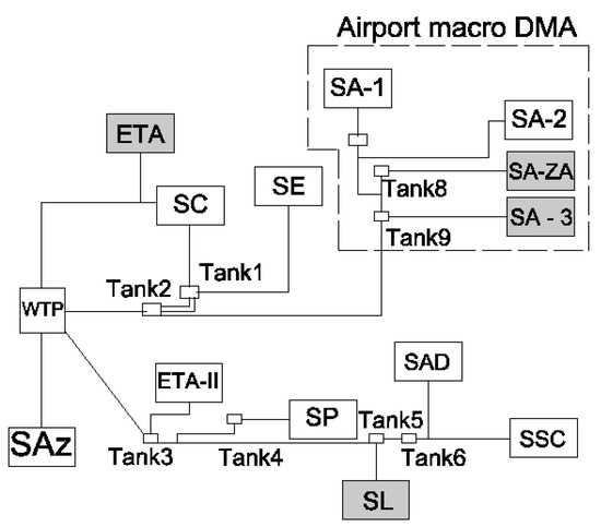 Three out of the four DMAs chosen for analysis are of similar size regarding the number of demand nodes. Specifically, the number of household connections for SA-3 is 2168, for SL is 2506, and for SA-ZA is 2728. These three DMAs are urban districts with small businesses, a common configuration for Brazil’s residential areas. The fourth DMA involved in the case-study is bigger than the other three. It is called ETA, has 10,439 household connections and also supplies a prison; thus, it is a sector of particular importance for the city water management. The time series for each DMA under study collects 4000 h water demand consumption data metered in litres per second. So, the data of the case-study covers a period of approximately five months.