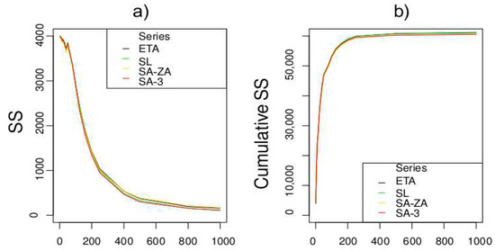 The dimension of the time series corresponding to the four DMAs of the case-study is reduced using SAX. Figure 6 shows the performance of the PAA tuning process. The reduction selection considers: (a) the accuracy of the PAA, in terms of the sum of squares—SS—computed as the distance between the arithmetic average for a PAA and the original values of the time series; and (b) the number reduction, represented by the number of segments. Under both criteria, it is taken 400 as the number of segments forming the PAA partition, with a dictionary or alphabet of four letters {a,b,c,d}. The letters are related to the various levels of water demand values in the time series; where a is the lowest level and d is the highest.