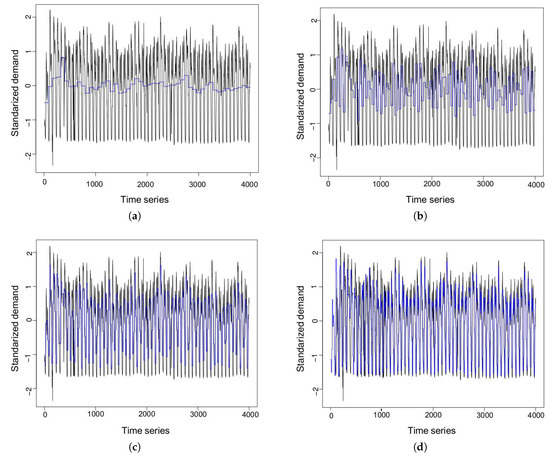 The accuracy of the various PAAs is better explained by Figure 7. This Figure shows various levels of PAA reconstruction of water demand for the case of the district SL: Figure 7a–d show PAAs for the time series reconstructions into 50, 100, 200 and 400 segments, respectively. This is a good representative example of how the accuracy level of a PAA depends on the number of segments in which the time series is divided, ranging from low fidelity time series reconstruction for a PAA with 50 segments (Figure 7a) to the higher PAA fidelity when using 400 segments (Figure 7d).